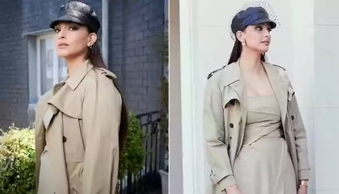 Sonam Kapoor's Dior outfit for the Dior shows features a beige-coloured midi dress styled with a matching trench coat. The dress has noodle straps, a layered design on the torso, a pin-up design on the waist, cinched waist, and a midi-length flowy skirt. She styled it with a matching coat featuring notch lapel collars, a front opening with contrast black button closures, and full-length sleeves.
